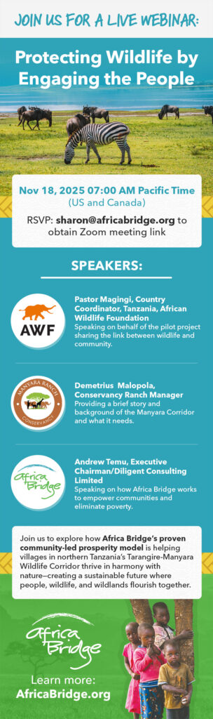 You may listen to our most recent Webinar – Poverty: Consequences, Perspectives and Actions. Chris Rich, Managing Partner of Perkins Coie LLP was our Emcee. Dr. Heath Prince, Director and Scientist, Ray Marshall Center for the Study of Human Resources, University of Texas spoke on the realities of extreme poverty. Dr. Andrew Temu, Executive Chairman of Diligent Consulting Ltd spoke about the long-range goals of the Tanzanian government. Barry Childs, Africa Bridge Founder, spoke about the plans to partner with the Manyara Ranch Management Trust to implement the program model in a wildlife corridor. Click here for the link
