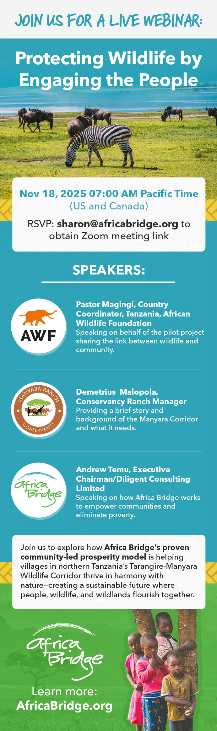 November 18 Webinar - Speakers from African Wildlife Foundation, Manyara Ranch and Africa Bridge
