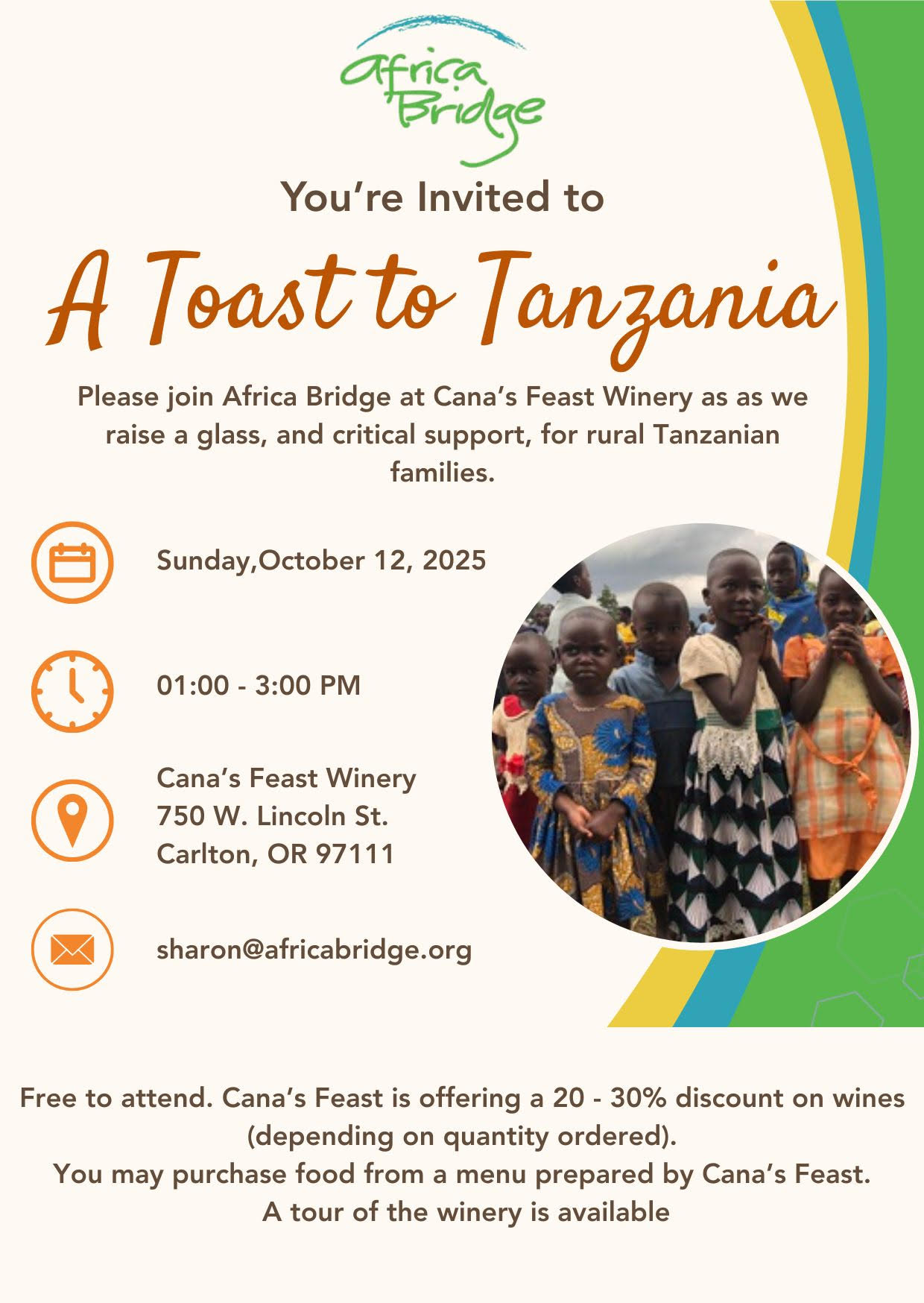 RSVP for ‘A Toast to Tanzania’ on October 12, 2025, from 1 to 3 PM at Cana’s Feast Winery. Barry will be speaking about our latest work in the Esilalei Ward, part of the Tarangire-Manyara Ecosystem. Email Sharon@africabridge.org with your RSVP and questions.
